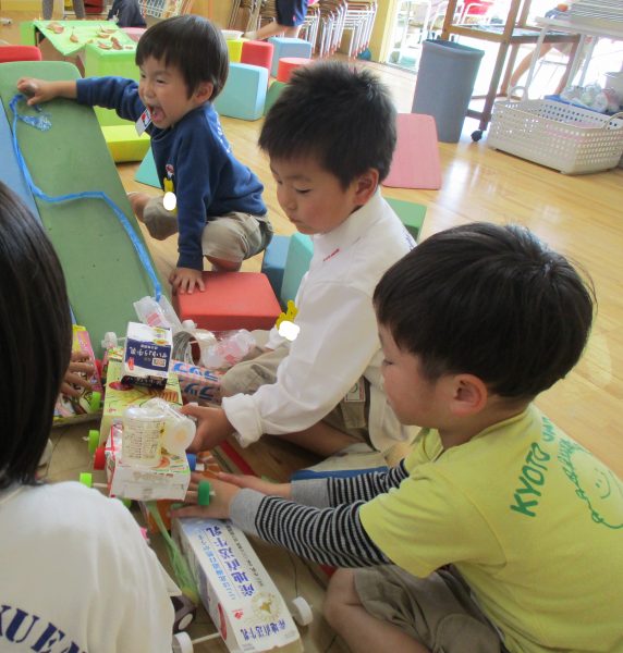 いろいろな素材を使ったり、今まで経験してきた木工遊びも取り入れながら友だちと考えを出し合ったり、力を合わせたり、工夫しながら創造的に遊ぶ姿が見られました。