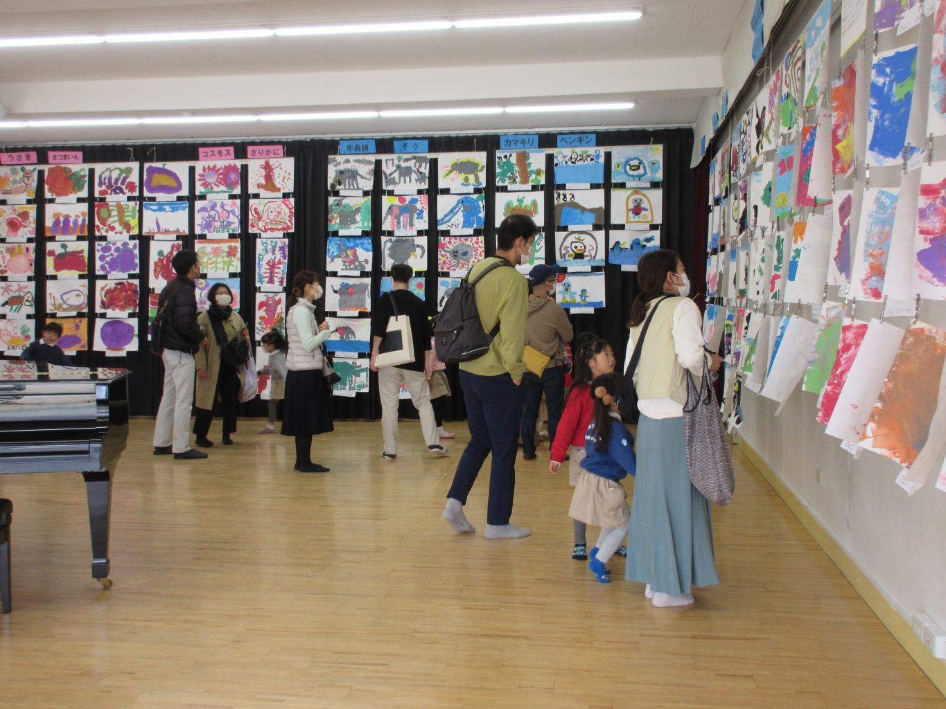 当日はホールに全園児の絵を展示し、各保育室には、クラス毎にテーマを持って製作したり、製作したものを使って子どもたちが普段遊んできた様子を保護者の方に見て頂きました。