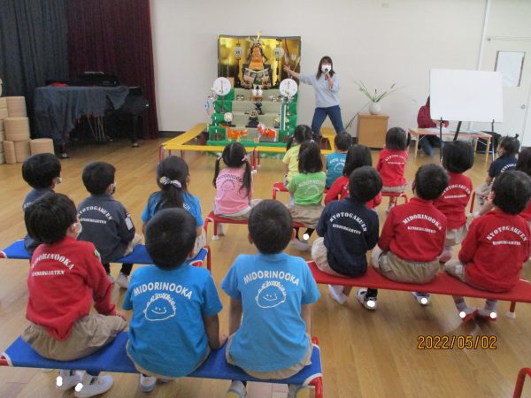 5月2日(月)は、こどもの日のつどいを行いました。年中組、年長組の子どもたちは、ホールで子どもの日の由来についてお話を聞いたり、先生たちによる「こいのぼりぐんぐんこどもの日」のパネルシアターを見たり、みんなで「こいのぼり」の歌をうたったりして、楽しみました。あひる組、ひよこ組、年少組はそれぞれの保育室で、こどもの日にちなんだ絵本や紙芝居を楽しみました。こいのぼりのように、元気いっぱい、そしてすくすくと健やかに育ちますように・・と願いました。