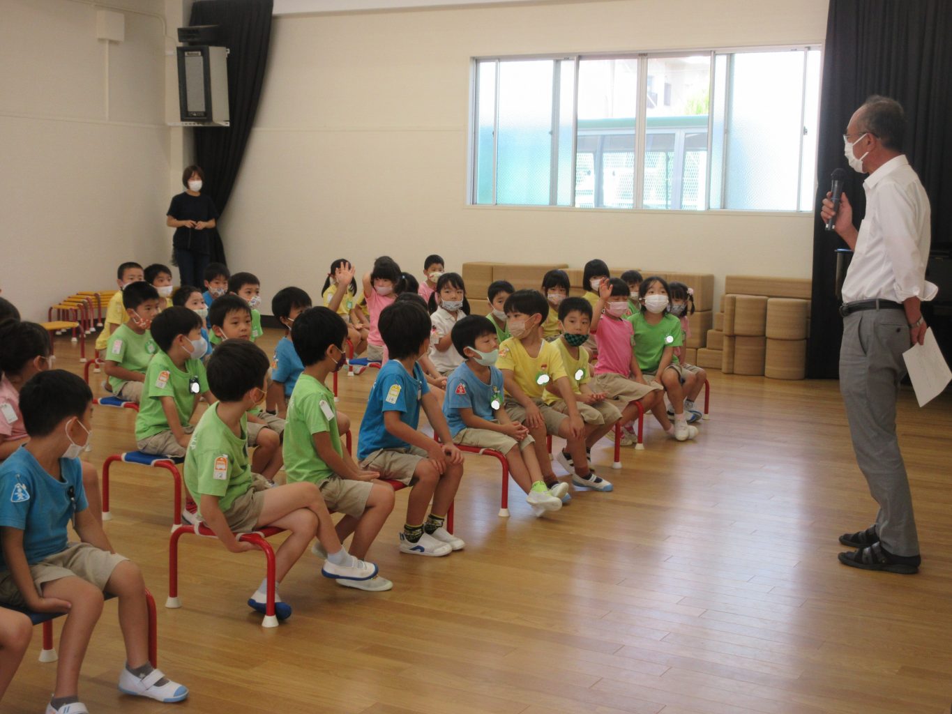夏休みを迎えるにあたって「川や海など水遊びをするときは、しっかりお父さんお母さんの話を聞きましょう。」「けがや病気をしないようによく寝てよく食べて元気に楽しい夏休みをすごしてくださいね。」と、園長先生から話を聞きました。