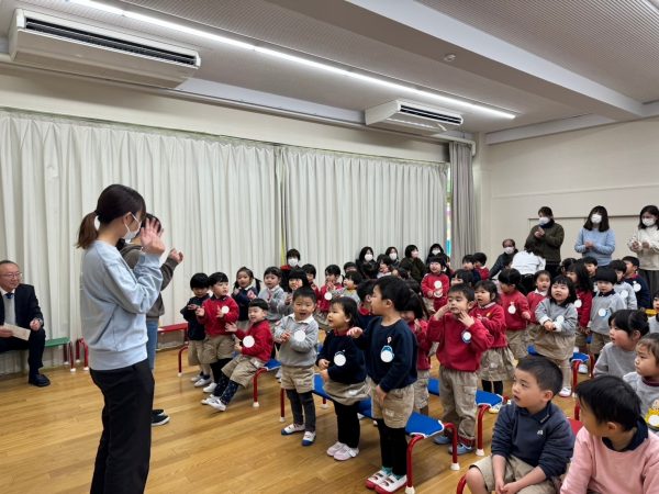 園長先生から、幼稚園で楽しかったことの問いかけに「こままわし!」「まめまき!」など、自分の好きな遊びを話す姿が見られました。