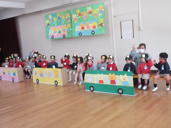 あひる組の子どもたちは、普段からねこになって友だちと一緒に遊んだりバスに乗っておでかけごっこをしたりして楽しむ姿が見られたので「ねこのおでかけ」をテーマに表現遊びを楽しみました。ねこになってみんなで作ったおべんとうを持ってバスに乗ったり、公園でダンスをしたりでこぼこ道を歩いたりして友だちや先生と一緒に遊んで楽しみました。