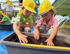 10.242025 年少組 チューリップの球根植え10月20日に赤・白・黄色・ピンクの球根の中から一つ選び、一人一つずつチューリップの球根を植えました。「いつチューリップが咲くの?」「明日咲く?」とチューリップが咲くことを楽しみにする姿が見られました。