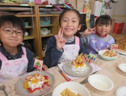 12月12日(金)、年長組でクッキングを行いました。今回はクリスマスも近づいてきたということもあり、生地を作って焼いたり、フルーツやお菓子を飾り付けてクリスマスをイメージしながらホットケーキ作りを楽しみました。