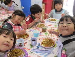 1月27日(火)にクッキング「焼きそば」を行いました。自分たちで人参やピーマン等の野菜やウインナーを切ったり、炒めたりして焼きそばを作りました。「人参、固いね💦」「キャベツって、固い所と柔らかい所があるんだね!」など、友だちと話をしながら様々な材料を切りました。