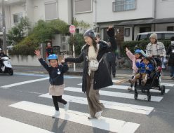 1月15日(木)、年長組の親子を対象に交通教室を行いました。4月からの就学に向けて、安全に登下校ができるよう、親子で第二大山崎小学校までの道のりを往復歩きました。向日町警察署の方と大山崎町の地活委員の方に来ていただき、道の歩き方や道路の渡り方について教えていただきました。