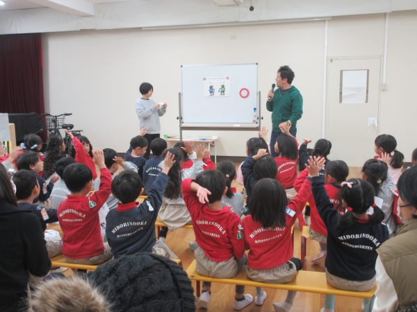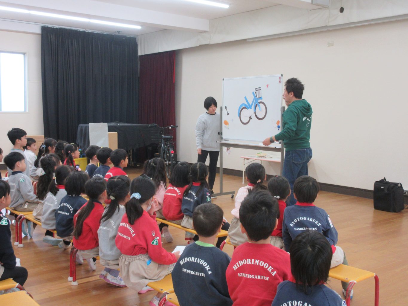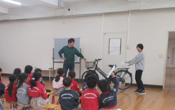 11月5日(水)に、年長児を対象に交通教室「自転車の乗り方」を行いました。先生による劇を見たり、自転車のパズル、安全な乗り方についてのクイズをしました。
