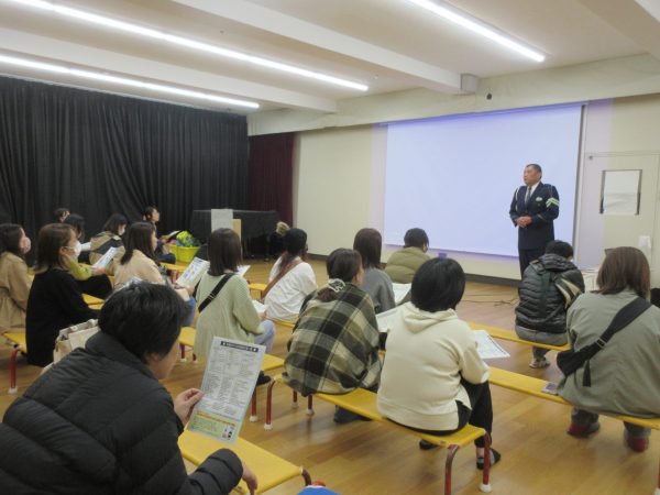 保護者対象には、向日町警察署の方に来ていただき、「自転車における交通安全指導」についてお話していただきました。自転車の交通ルールや子どもへの指導ポイントなど、保護者の方も熱心に聞いておられました。