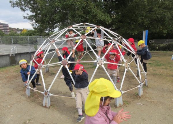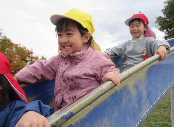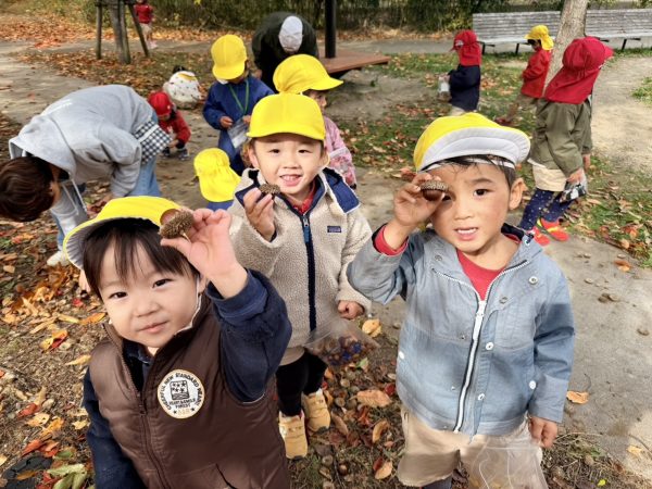 11月18日(火)、年少組の園外保育で水無瀬川緑地公園へ行きました。子どもたちは朝から「遠足行くよ!」「バス乗るの楽しみ!」「おにぎり持ってきたよー」と、待ちきれない様子の子どもたち。バスに乗って出発!公園が見えてくると「大きいすべりだいある!」「どんぐりあるかな?」とわくわくとした様子が見られました。公園に着くと大きなローラーすべりだいやアスレチックの遊具で体を動かして遊んだり、どんぐりや葉っぱを集めて遊びました。みんなで一緒にいろいろな遊びを楽しむことができて、大喜びでした。
