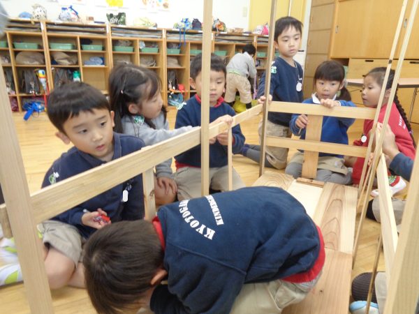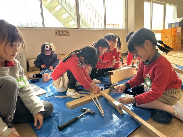 友だちと一緒に木工遊び。力を合わせてブランコやピアノを作ったよ!