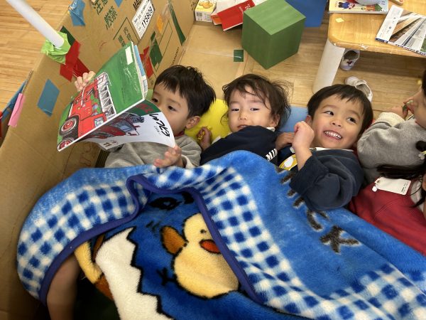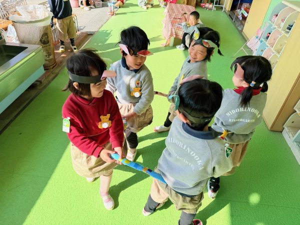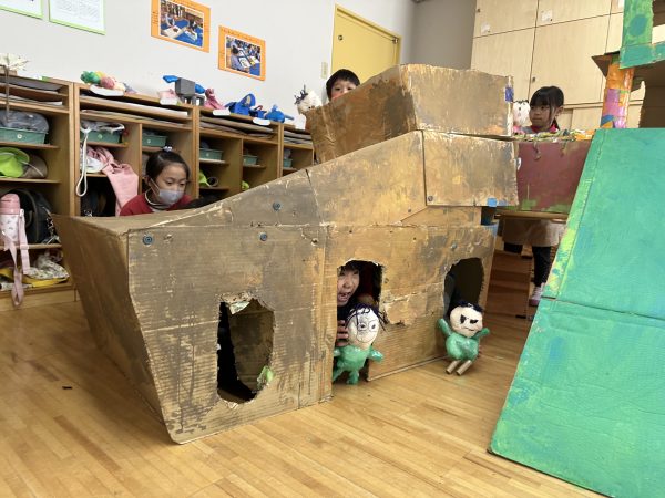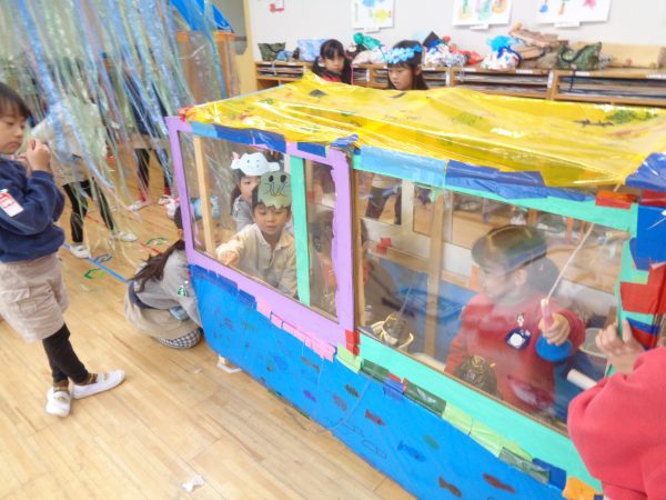年長組では、「お話を聞いたり、経験したことを通して、友だち同士でイメージを共有し、考えを出し合ったり、協力したり、工夫しながら創造的に遊ぶ楽しさを味わおう。」をテーマに取り組みました。