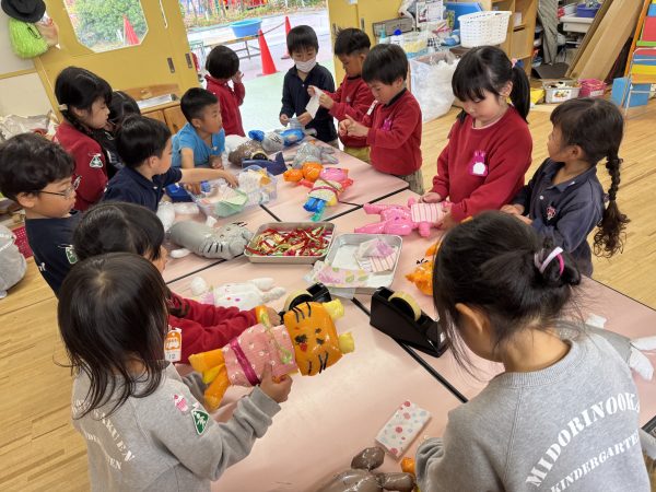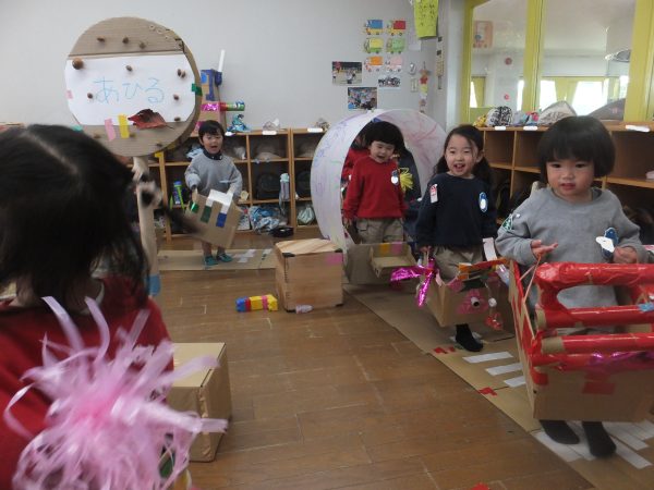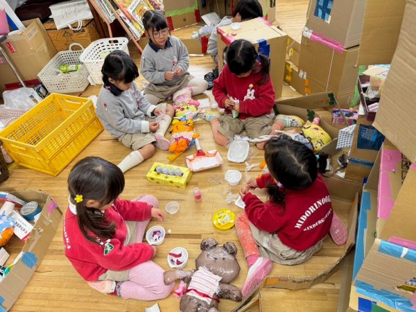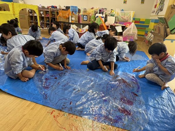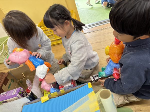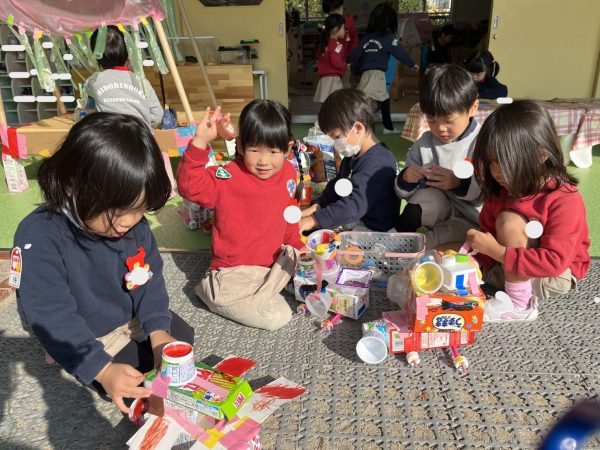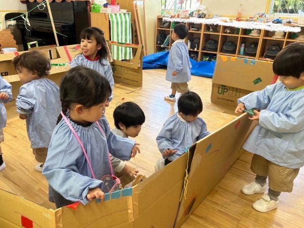 年少組では、「形にとらわれず自由な発想で作ったり描いたり、のびのびと表現することを楽しんだり、ごっこ遊びを楽しむ中で友だちと作ったもので遊ぶ楽しさを味わおう。」をテーマに取り組みました。