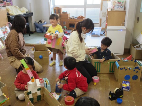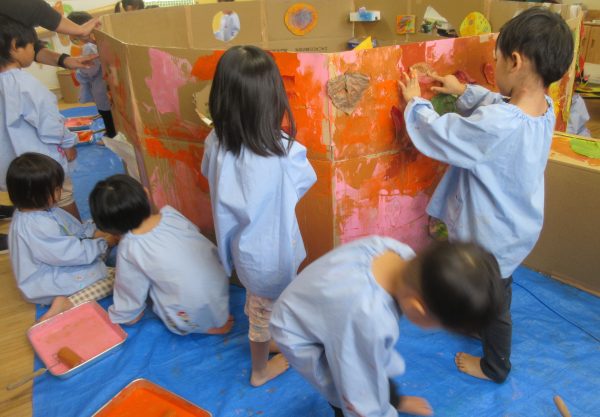 みんなでテープを貼ってかわいいお家を作ったよ!