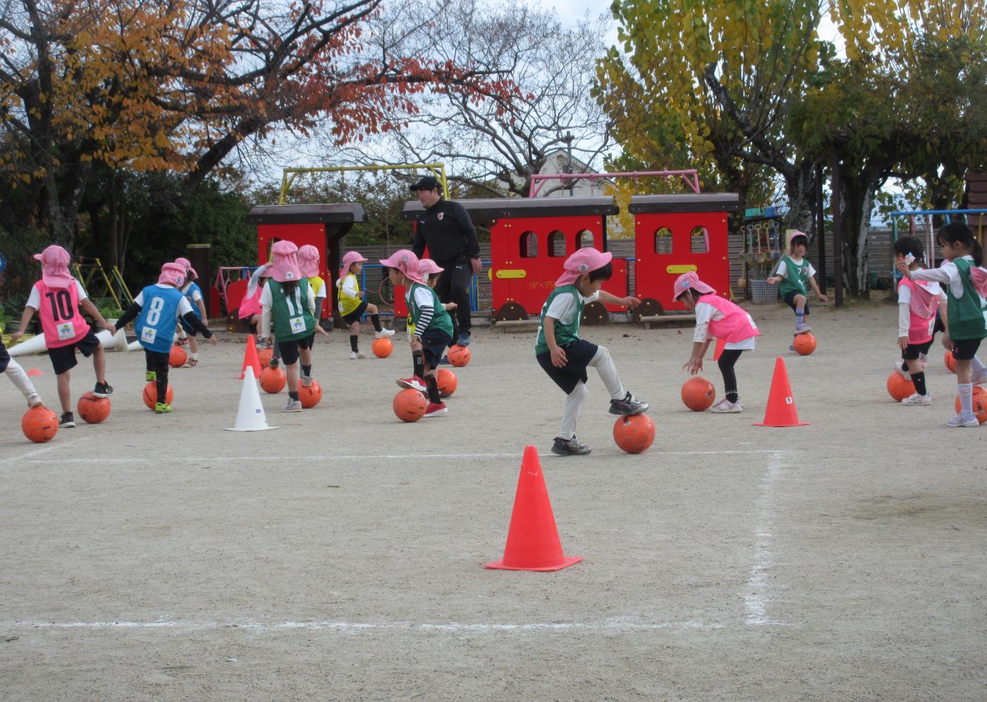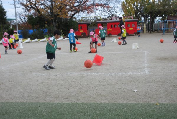 最初はボールを持たず、ゲーム感覚でカラーコーンをタッチして走り回る所から始まりました。身体が温まってくるとサッカーボールを使い、ボールとお友だちになれるように投げてキャッチをしたり、ドリブルをしたり、キックをしてコーンを倒したりしてサッカーを楽しんでいました。