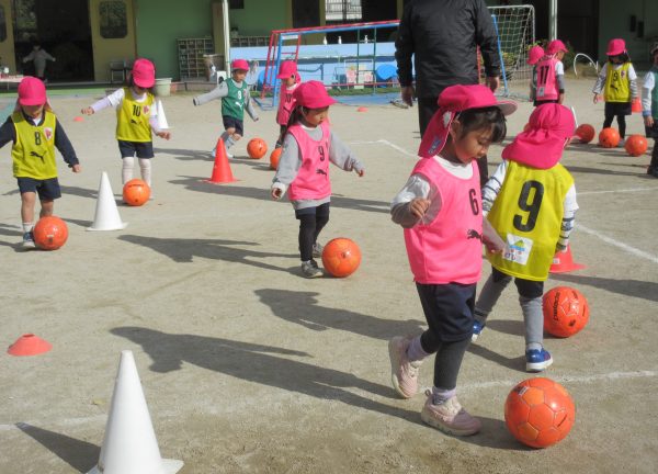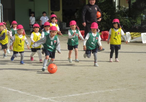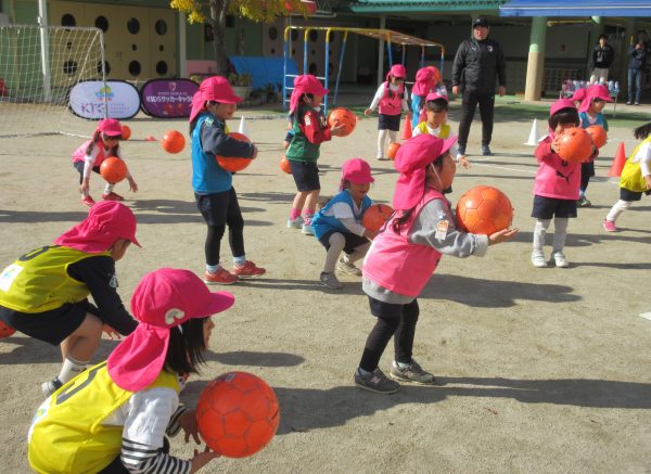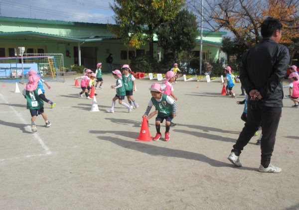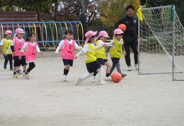 11月28日(金)京都パープルサンガのコーチに来ていただき、年中組を対象にサッカー教室体験を行いました。