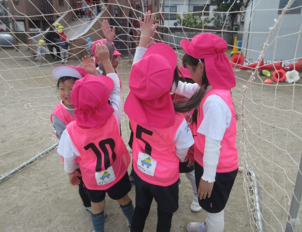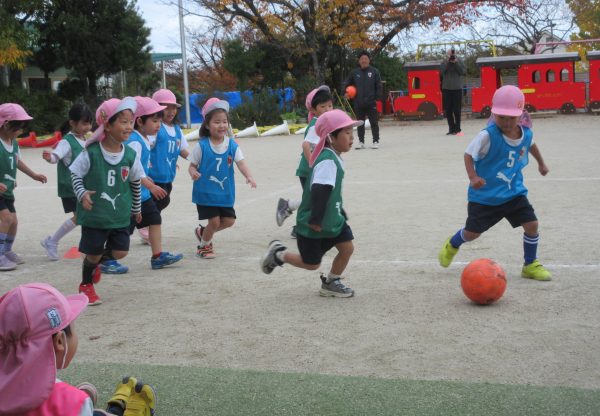 最後にはチームに分かれてゲームを行いました。頑張ってボールを追いかけたり、ゴールに入らない様に守ったり、シュートが決まったら喜んだりと、どの子どももサッカーを楽しむ姿が見られました。