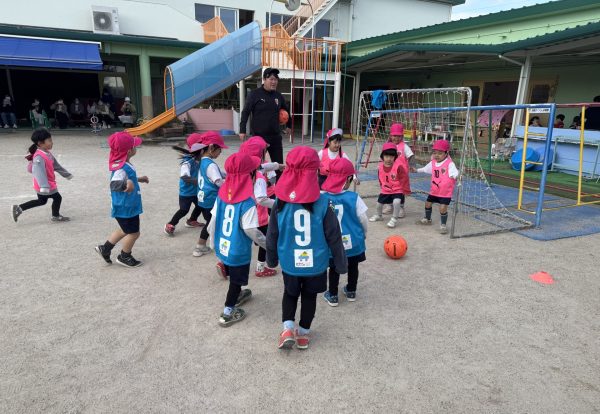 サッカー体験教室を終えた後、昼食後に園庭に出て友だちとサッカーを楽しむ姿が見られました。今回のサッカー体験教室を通して、サッカーに興味を持ち、楽しさを感じたり、友だちと一緒にボールを使って遊ぶ楽しさを味わうことが出来ました!!