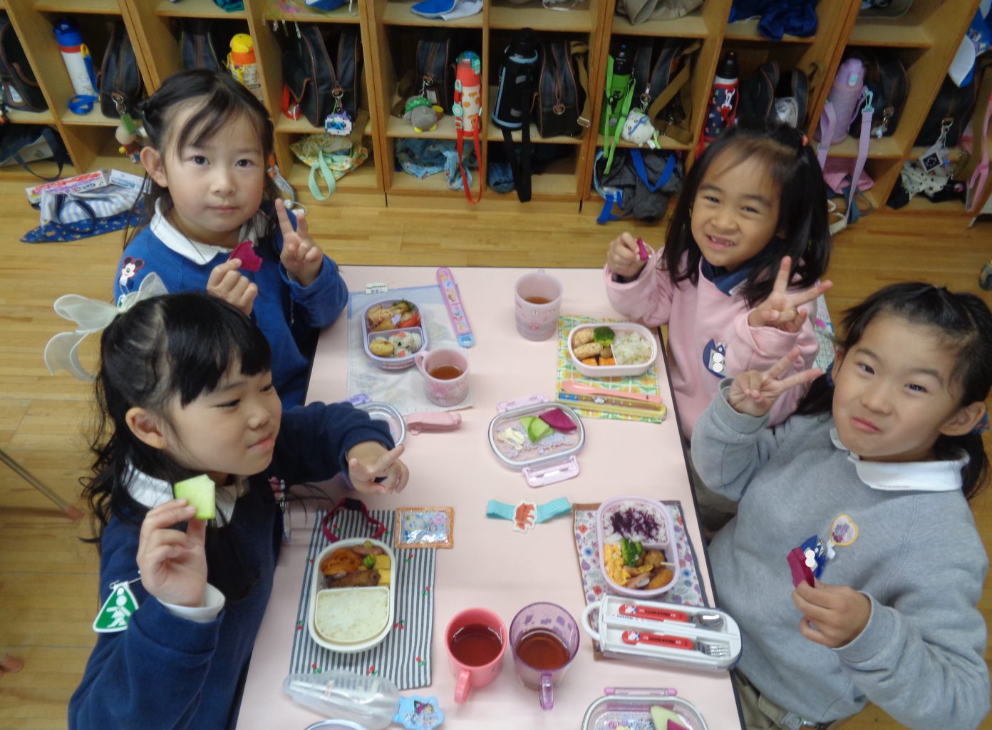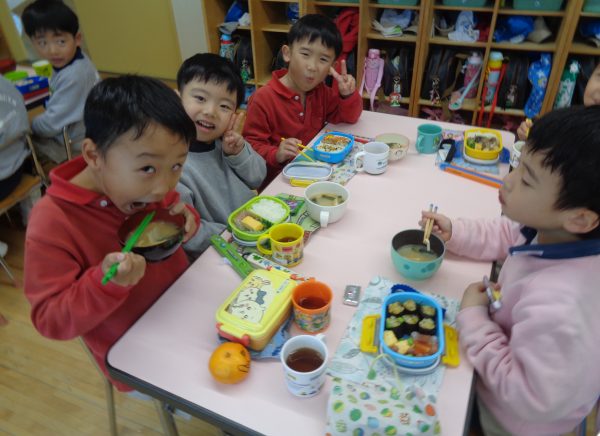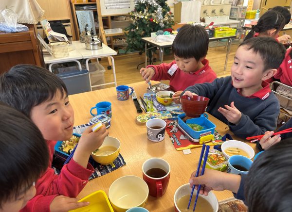 大根のみそ汁も、大根を煮る様子を見ているうちに「大根が透明になってるよ!」と変化に気づいたり、出汁やみその匂いに「おいしそう~!」と待ちきれない様子の子どもたち。お弁当と一緒にいただき、「あったかくておいしい!」「大根の葉っぱ、初めて食べた!」と喜んで食べる姿が見られました。