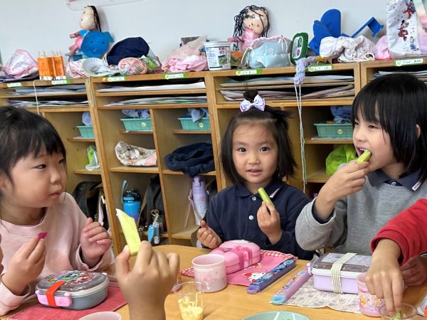 生のままの大根は初めて食べる子どもも多く、「どんな味かな?」と少しドキドキしている様子も見られましたが、「大根の匂いがする!」「ぽりぽりしてておいしい!」「赤い大根は甘いよ!」と、それぞれ匂いや食感、味を楽しんでいました。