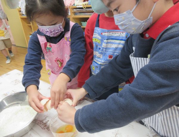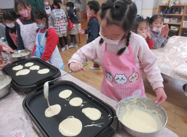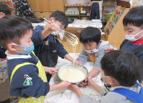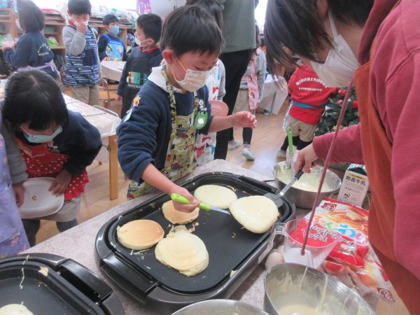 12月12日(金)、年長組でクッキングを行いました。今回はクリスマスも近づいてきたということもあり、生地を作って焼いたり、フルーツやお菓子を飾り付けてクリスマスをイメージしながらホットケーキ作りを楽しみました。