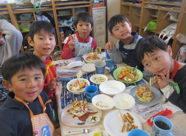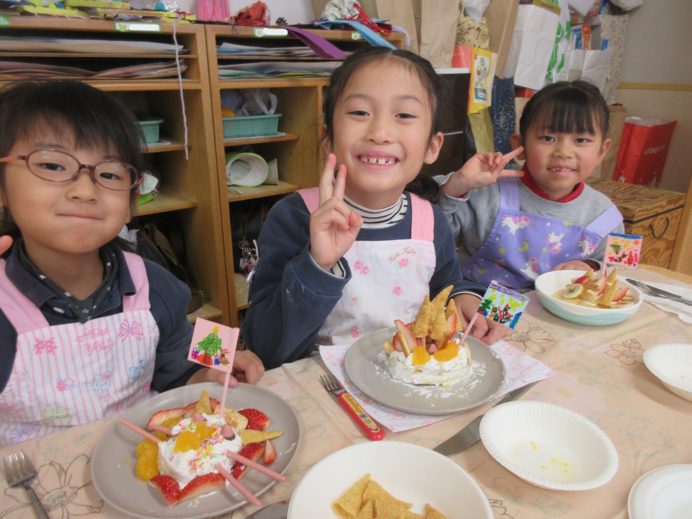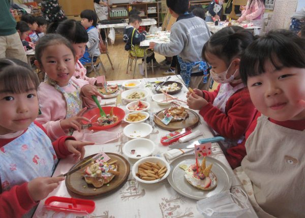 ホットケーキが焼けると、バターやシロップ、クリームを塗り、好きなトッピングを選んで飾り付けを楽しみました。クリスマスケーキやお城、トナカイなど、ひとりひとり自分なりにイメージを持って飾り付けていく姿が見られました。自分たちで作ったホットケーキはとてもおいしく、おなかいっぱい食べて大満足の子どもたち。クリスマスへの期待感も高まり、楽しいクッキングとなりました。