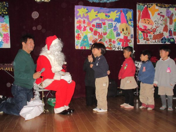 つどい当日、ホールにサンタさんがやってくると、「サンタさん来たよー!」と目を輝かせて喜ぶ子どもたち。歌サークルさんや保護者のみなさんの歌や演奏をサンタさんと一緒に楽しんだり、サンタさんにクリスマスの歌をプレゼントして楽しみました。最後にサンタさんからプレゼントをいただき、子どもたちは大喜び!