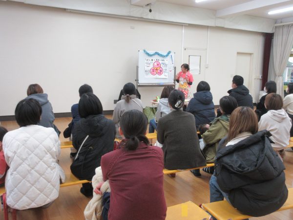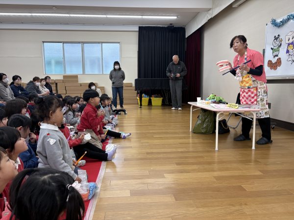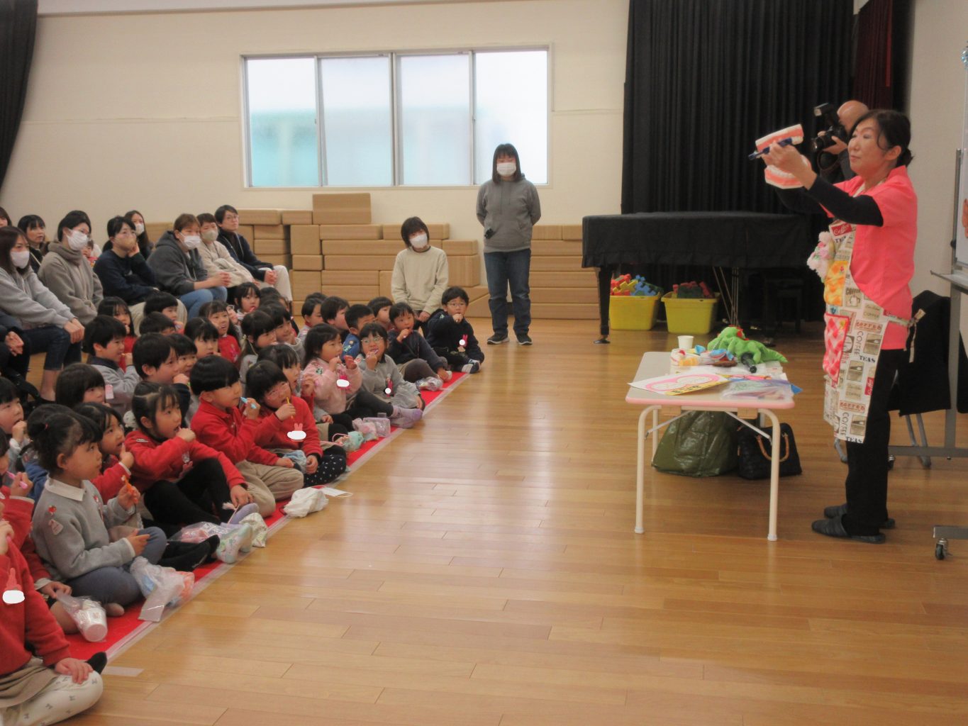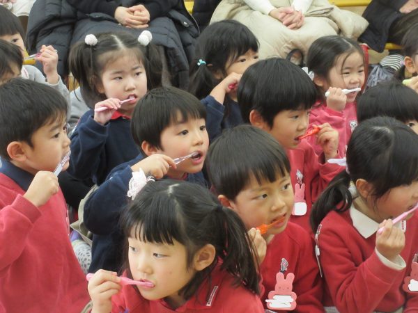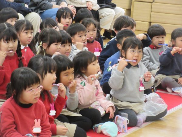 1月13日(火)、年中組対象に歯磨き指導がありました。歯科衛生士さんから、なぜ歯を磨くのかや虫歯にならない為に出来ること、歯の磨き方などを教えてもらいました。