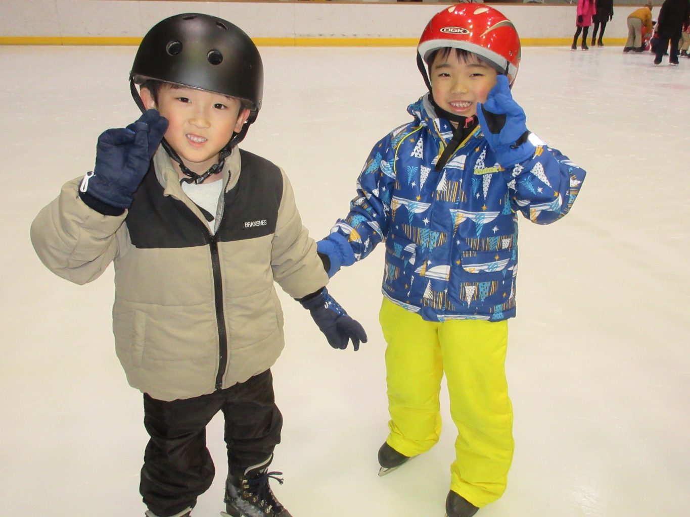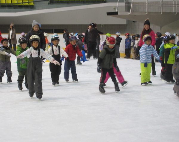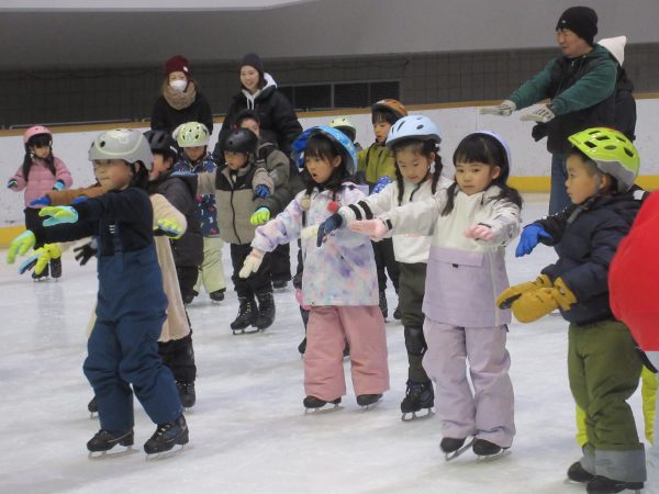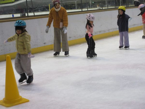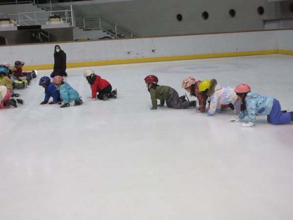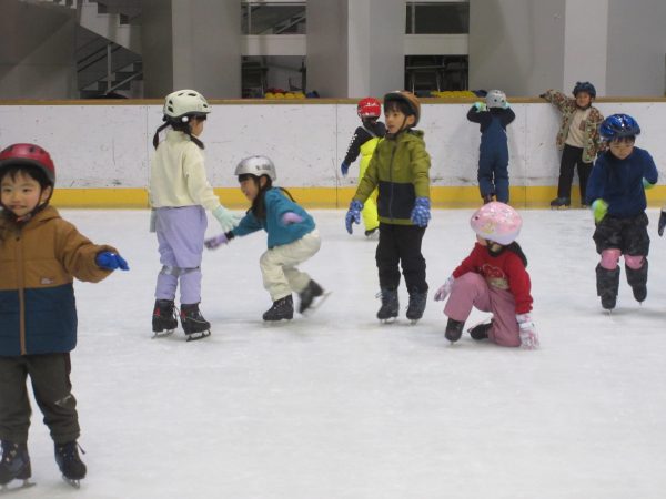 まず最初にリンクサイドでインストラクターの方と一緒に体操をしたり、滑り方やこけた時の立ち方の練習をしました。リンク内では様々な滑り方を教えていただき、何度も転びながら意欲的に滑ろうとするたくましい姿が見られました。「せんせい!こけずに滑れるようになったよ!」と、少しずつひとりで滑ることができて、とても嬉しそうでした。