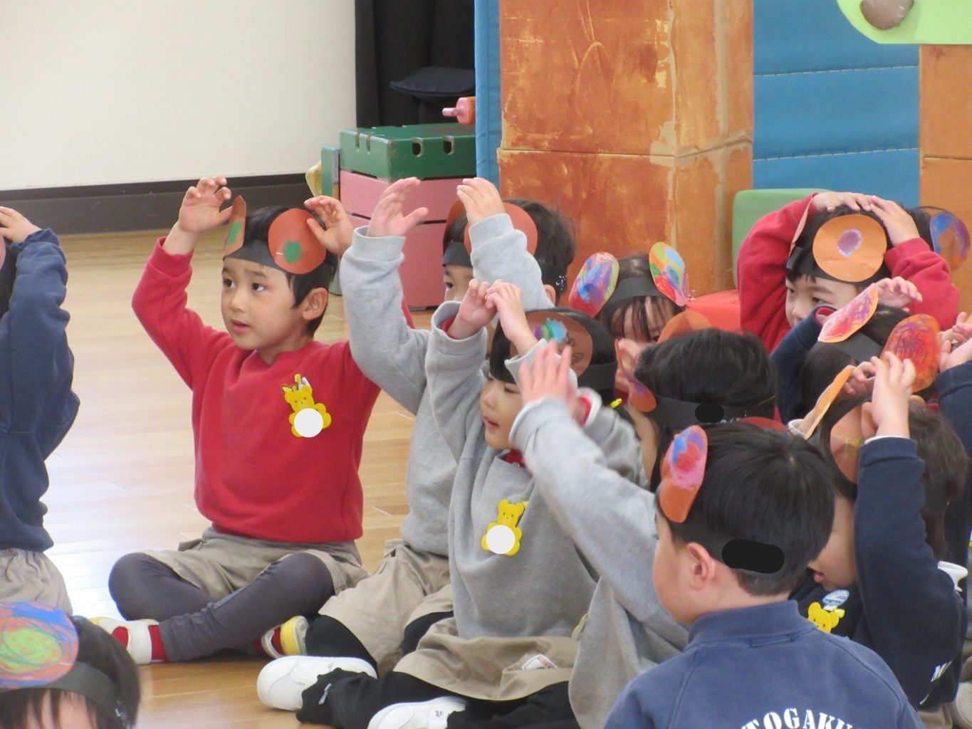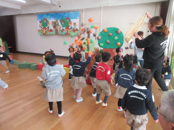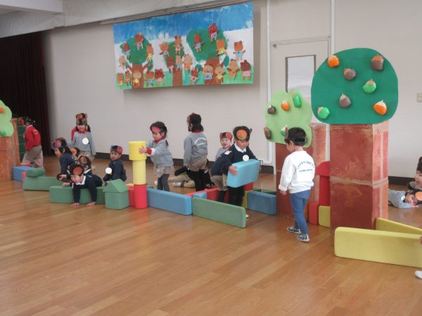 たんぽぽ組の子どもたちは、くまになって遊ぶことを楽しみました。普段から大型積み木でお家を作って遊ぶことや簡単なルールのあるむっくりくまさんの遊びが好きなので、発表会の中に取り入れて、普段楽しんでいる姿を見てもらうことが出来ました。