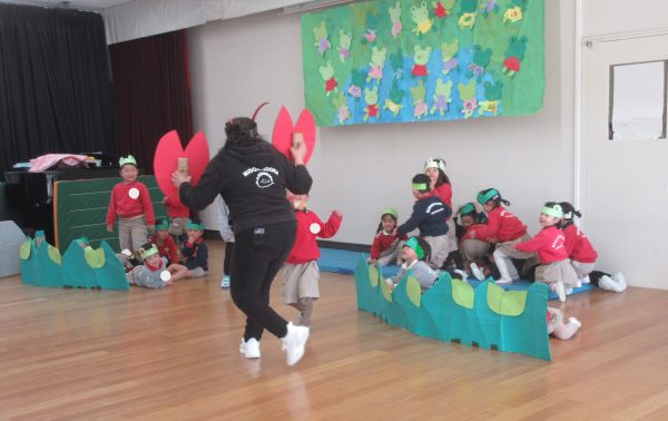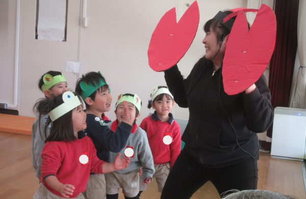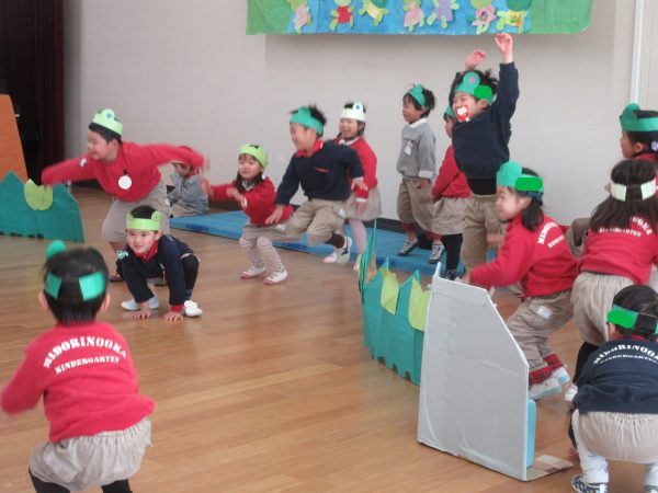 チューリップ組の子どもたちは、普段から「10ぴきのかえる」のお話が好きで、かえるごっこをして遊ぶ姿が見られるので、お話をもとに表現あそびをしました。どの子もかえるになりきって、元気にジャンプして遊んだり、みんなで歌ったり、踊ったりして楽しみました。また、ざりがにやへびにみつからないように隠れるなど友だちや保育者と一緒に遊ぶことの楽しさを味わっていました。