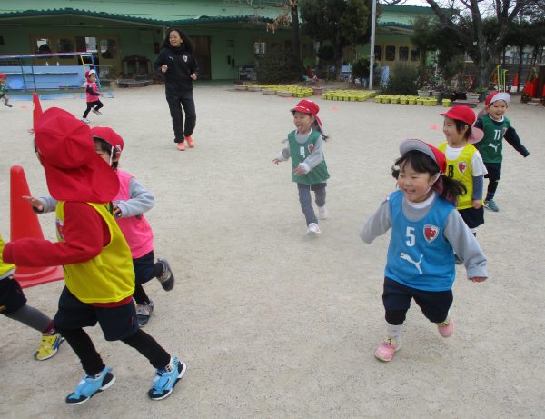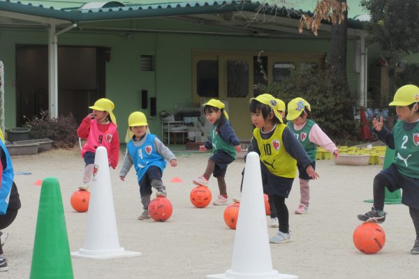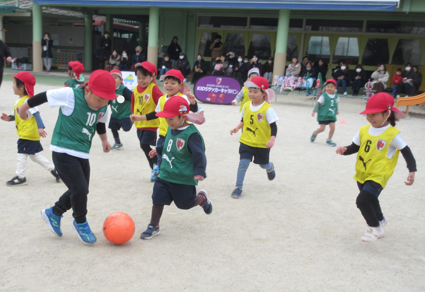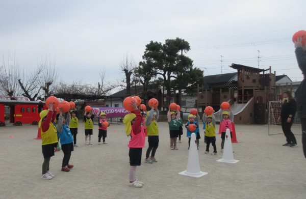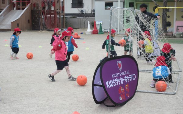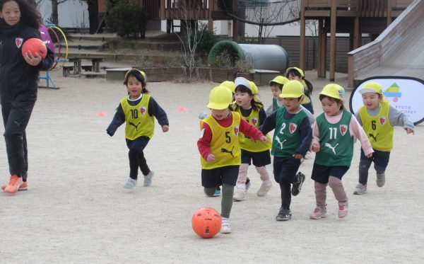 2月20日(金)に京都パープルサンガのサッカーキャラバン活動でサンガのコーチによるサッカー体験教室を実施いたしました。今回は年少組の子どもたちを対象に行ないました。初めてのサッカー教室にドキドキワクワクしいていた子どもたちです。始めは、ボールを使って体操したり、ボールを足の裏で転がしてみるなどボールに触れて親しむことから楽しみました。上手に出来たことが嬉しくて、「みてみて!!」と自慢気に見せたり、どの子どもも真剣に取り組む姿が見られました。最後は、2チームに分かれて、簡単な試合を楽しみました。ボールを必死で追いかけたり、園庭中をみんなで駆け回って楽しんでいました。自分のチームの色のゴールにシュート出来た時は大喜びでした。
