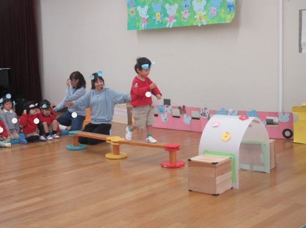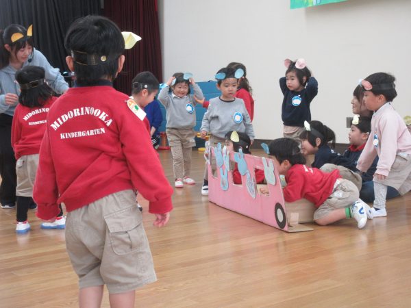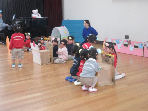 あひる組の子どもたちは、普段から大型積木でバスを作って友だちと一緒に乗ってえんそくごっこをしたりして楽しむ姿がみられたので、「ねずみのえんそく」をテーマに表現遊びを楽しみました。ねずみになってみんなでバスに乗ってえんそくに行ったり、公園でダンスをしたり、一本橋を渡ったり、ねこさんと追いかけっこをしたりして友だちや先生と一緒に遊んで楽しみました。