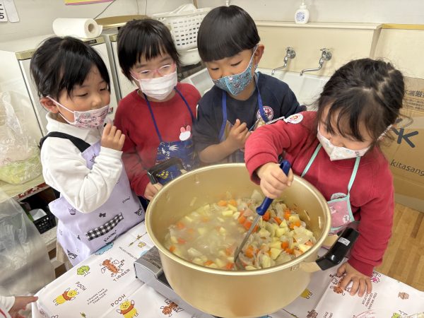 2月27日(金)に年中組の子どもたちが、玉ねぎや人参、じゃがいもなどの野菜切ったり、お鍋をかき混ぜてカレーライス作りを楽しみました。「じゃがいも上手に切れたよ!」「人参は固いね」「玉ねぎは柔らかいけれど、涙が出てくるよ」と野菜によって固さが違うことに気付いたり、野菜とひき肉を炒めると、「いい匂いするなぁ~」「早く食べたい!!」「美味しくなあれ!」と期待を膨らませていました。みんなで作ってみんなで食べたカレーは、とっても美味しかったです♪