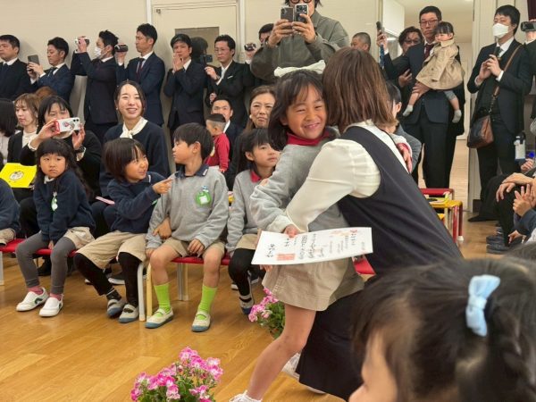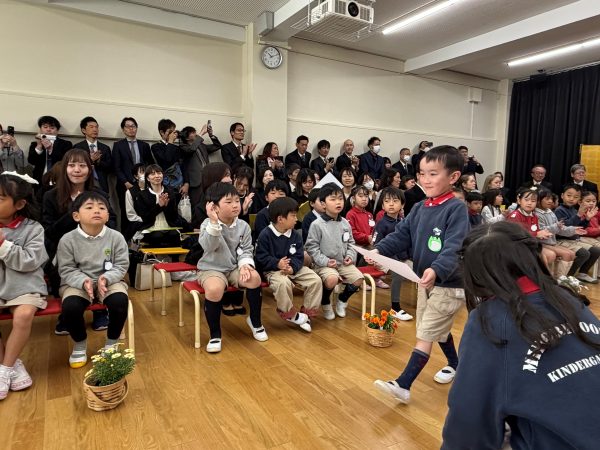 園長先生から一人ひとり、修了証書を受け取りました。どの子も名前を呼ばれると元気よく返事をして、自信と期待に満ちた表情で保護者の方のもとへ歩いていきました。
