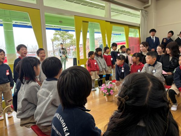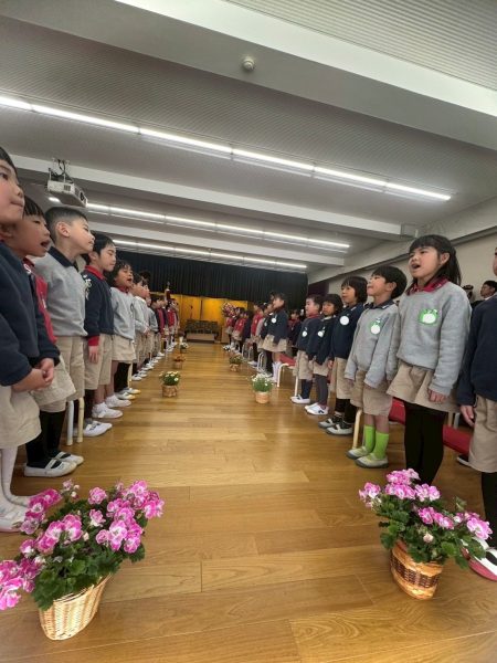 また、各クラスで幼稚園での思い出を話し、相談して考えた「おわかれのことば」を思いを込めて伝えたり、♪みんなともだち、や、♪ありがとうこころをこめて など大好きな歌をみんなで歌い、子どもたちが立派に成長した姿を感じました。