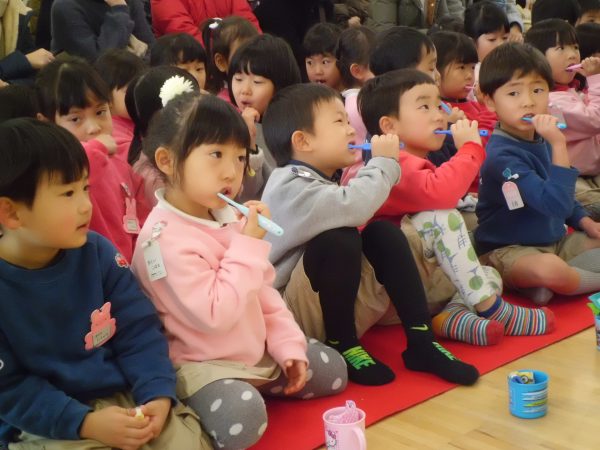 好き嫌いをせず何でも食べること。自分で磨いた後も必ずお家の人に仕上げ磨きをしてもらうこと。歯を磨いた後3回はグチュグチュうがいをすること。歯ブラシの持ち方、歯の磨き方などを教えてもらいました。