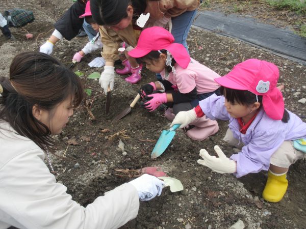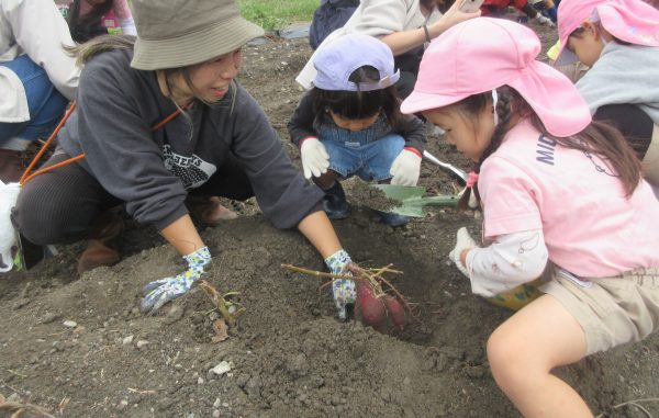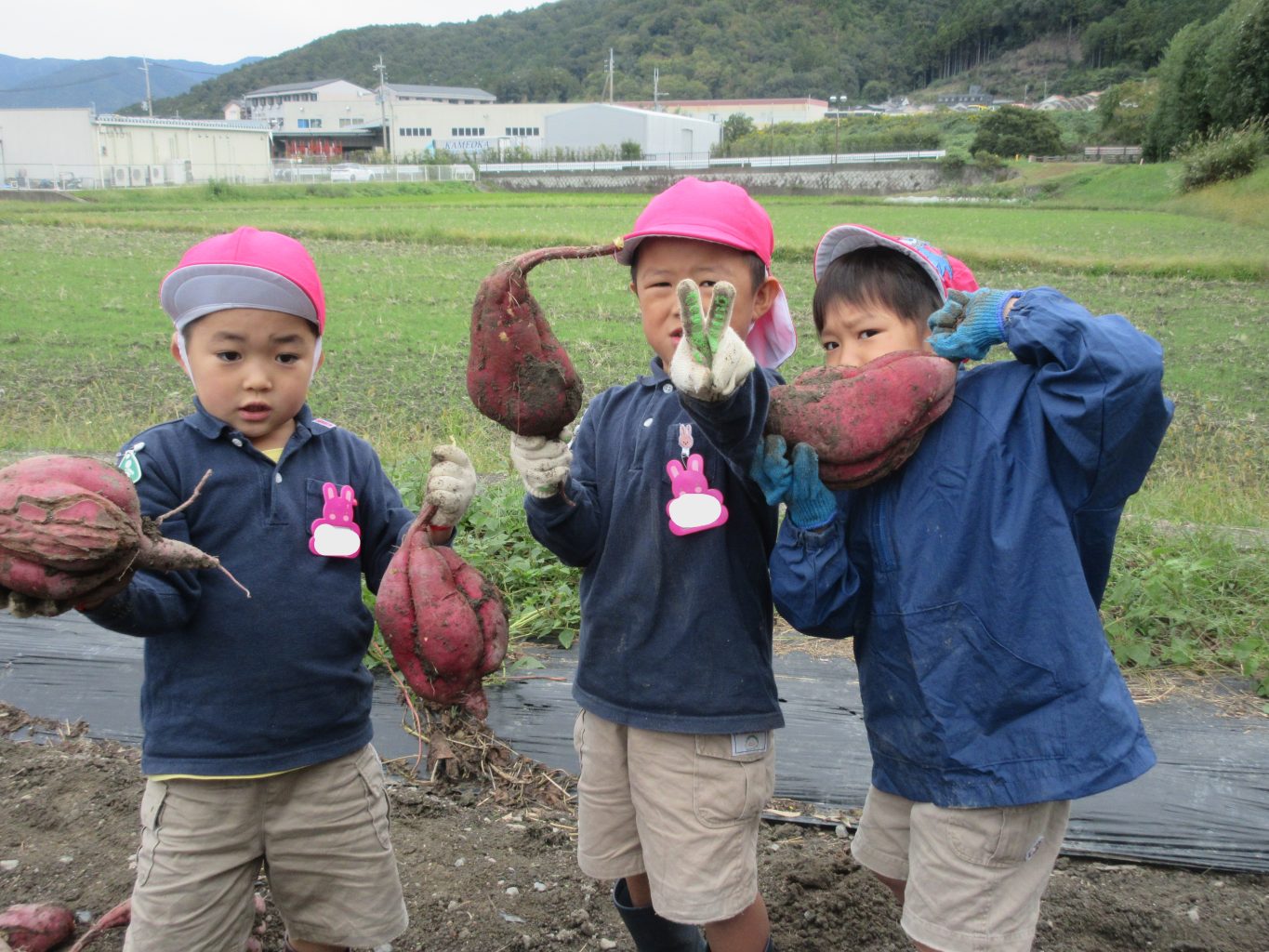 当日は「お芋がおっきい!」「いっぱいくっついてる!」「根っこが長いよ!」と掘り起こしたさつまいもを見て嬉しそうに話したり、歓声を上げながら芋ほりを楽しんでいました。